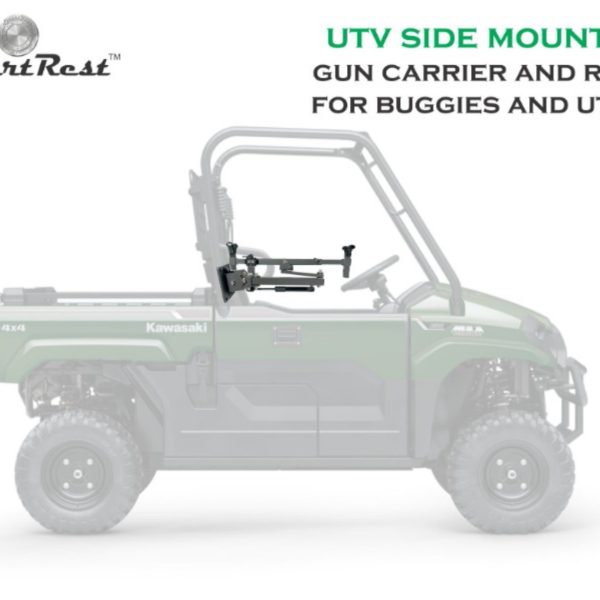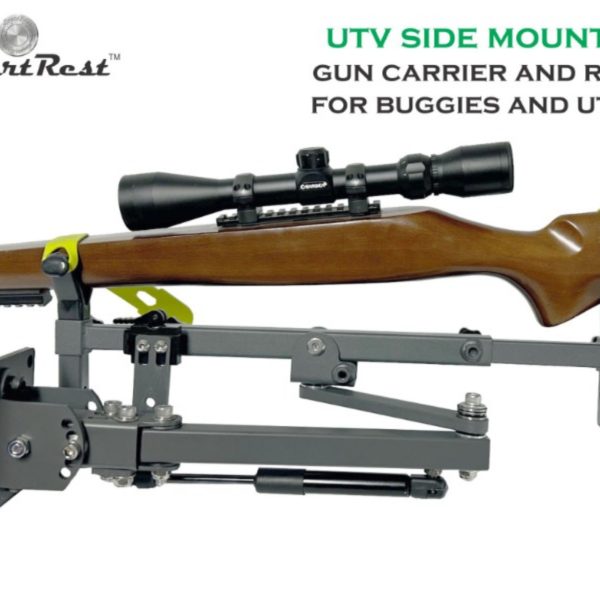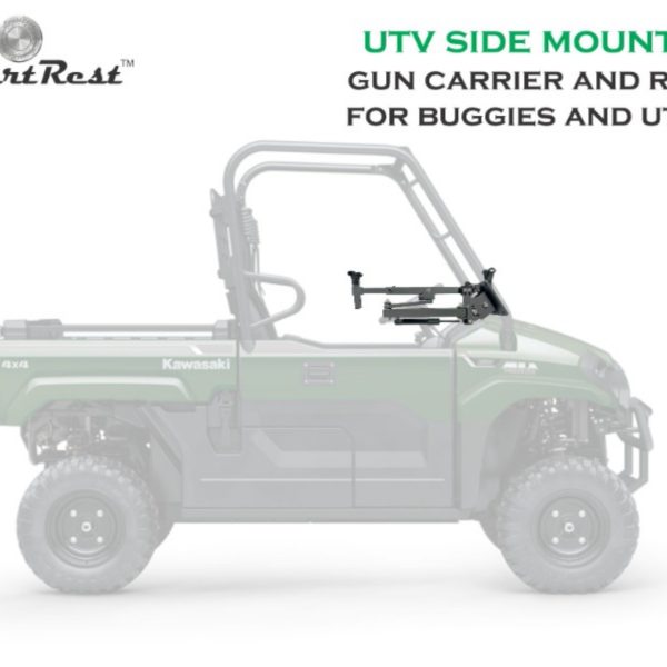 The UTV Side Mount 3 Gun Rest is a steel-framed Gun Rest and Cradle system that stores a firearm in a safe position while traveling and acts as a stable rifle support for excellent accuracy while taking a shot. It is designed to be mounted in the doorway opening of a side-by-side or UTV vehicle. Usual mounting points are (but not limited to) handlebars or roll bar pipes in the doorway opening of the vehicle door entrance. The advantages of a mounted firearm in this location are: