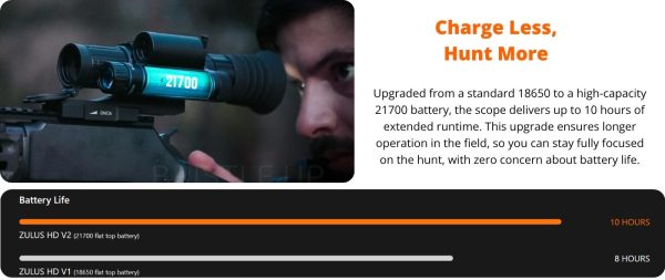 Designed for field endurance, the V2 runs on a high-capacity 21700 battery, offering up to 10 hours of runtime, a significant upgrade over the previous generation. A redesigned magnification lever replaces the V1’s wheel for fast, glove-friendly adjustments, while 65mm of eye relief ensures safer, more comfortable shooting over extended sessions.