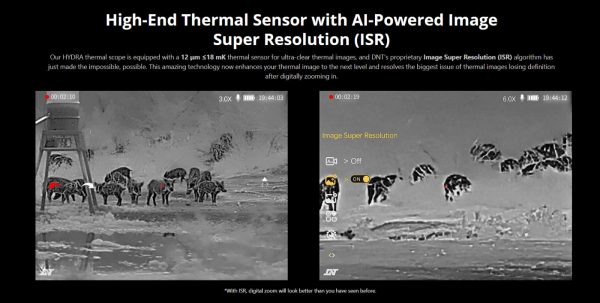 The DNT Hydra HS635 thermal imager features a high-performance 12μm ≤18mK thermal sensor combined with DNT’s proprietary Super Resolution image algorithm—taking thermal imaging to the next level. This innovative technology dramatically enhances image clarity and solves the common issue of losing detail when digitally zooming in.