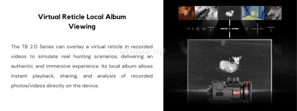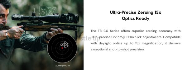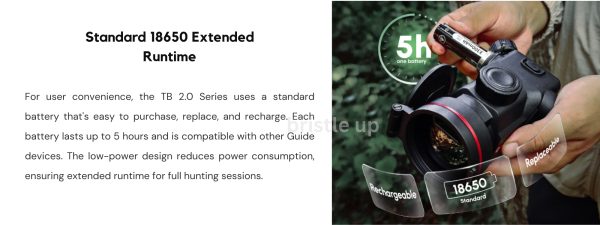 The TB 2.0 Series is a thermal clip-on tailored for hunting. It brings precision in silence while integrating multiple intelligent features into a compact, lightweight housing weighing under 490g: G-Zero shutterless technology, an in-lens LRF, the Hyper-light image enhancement algorithm, and the standard replaceable 18650 battery. It delivers unmatched downrange accuracy and exceptional handling convenience in the field.