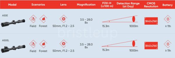 With a focal length of 50mm and F1.2–F2.5 adjustable aperture, in conjunction with a 4K UHD detector, coupled with an integrated 1000m laser range finder, A50EL ensures hunters in both open field and forest a suitable field of view marvelous benefits. You can use your own IR Torch for nighttime hunting.