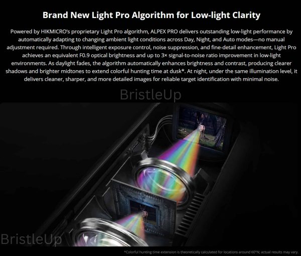 HIKMICRO’s proprietary Light Pro algorithm sets the A50PL apart in challenging lighting conditions, automatically adapting between Day, Night, and Auto modes without manual intervention. This intelligent system achieves equivalent F0.9 optical brightness through advanced exposure control, sophisticated noise suppression, and fine-detail enhancement technologies, delivering up to 3× improved signal-to-noise ratio in low-light environments. The result is consistently clear, bright imagery that maintains exceptional detail retention from dusk through the darkest hours, making it ideal for Australia’s diverse hunting scenarios and wildlife management requirements. Compatible with Australian firearms regulations when properly mounted and zeroed, this professional-grade digital scope represents the ultimate fusion of advanced optics, intelligent imaging technology, and precision rangefinding in a robust, field-ready package.