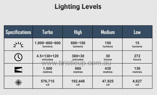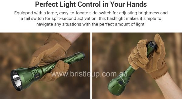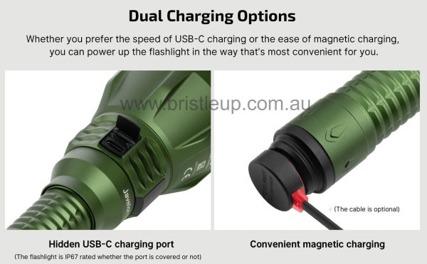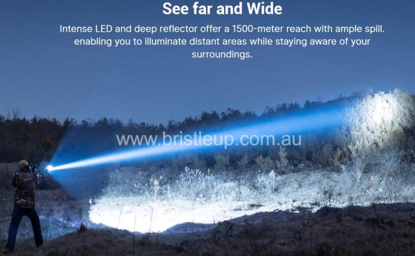 The Javelot Turbo 2 is a full-size, long-range flashlight designed for hunting or search-and-rescue applications. At maximum output, it can throw a focused beam of 1,800 lumens up to 1,500 metres. Furthermore, the light can pair with a wireless remote, allowing control from 8 metres away. The magnetic dock on the flashlight secures the remote and charges it simultaneously. Powered by a 5,000 mAh battery pack, it offers up to 272 hours of runtime and can be easily replaced by unscrewing the tail cap. With both USB-C and magnetic charging capabilities, the flashlight provides exceptional charging flexibility. It can also be mounted to a setup using the X-WM03 magnetic mount, transforming it into a superlong-range WML. Whether you’re hunting, searching for a lost person, or checking the backyard, the Javelot Turbo 2 is exactly what you need.