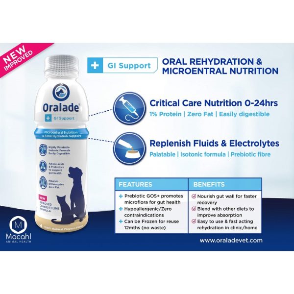 ORALADE GI SUPPORT 500ml REHYDRATE -Rehydrate Electrolyte For Dogs -Ready to use balanced isotonic formula for quick fluid absorption & rehydration -Essential electrolytes, amino acids, nutrients & glucose in purified water -Highly palatable 100% natural hypoallergenic chicken flavor -Highly digestible, with easily absorbed nutrition & prebiotic fibers for gut health -Specifically designed for maximum hydration