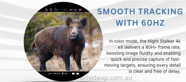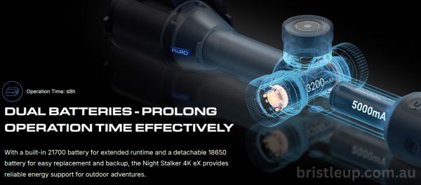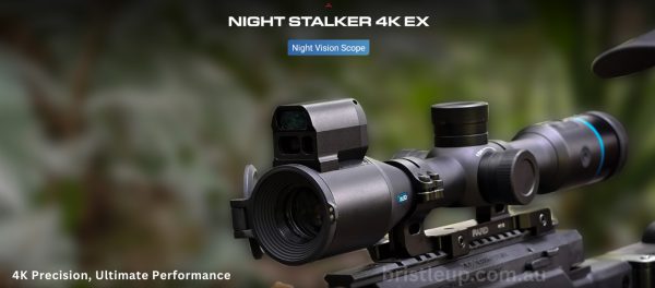 Durable and versatile, the Night Stalker 4K eX includes a detachable IR & laser rangefinder module (effective up to ~1000 m), an onboard ballistic calculator, recoil-activated loop recording, selectable reticle styles (6 shapes, 4 colors), built-in Wi‑Fi/HDMI output, IP67-rated rugged aluminum construction, and a dual‑battery system (integrated 21700 + removable 18650) supporting up to ~8 hours of operation.