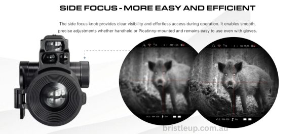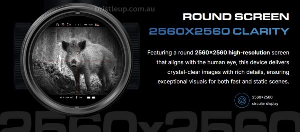 Central to its design is a striking 2560 × 2560 circular OLED display, offering a natural and immersive view that aligns with the human eye. In color mode, it runs at a smooth 60 Hz frame rate for better tracking of fast-moving targets. The unit offers optical magnifications from 4× to 8× (depending on lens), with additional digital zoom up to 4× and Picture‑in‑Picture functionality for rapid target identification.