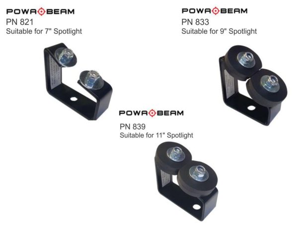 PowaBeam spotlight Brackets. PN821 is suitable for 7″. PN833 is suitable for 9″. PN839 is suitable for 11″.