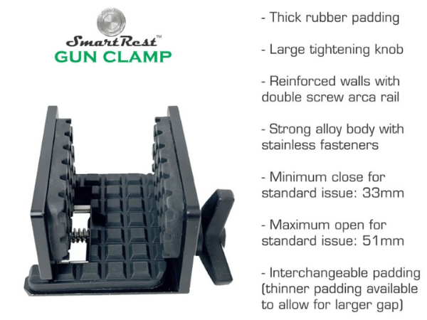 The Gun Clamp is a SmartRest designed clamp with thick padded walls, a strong reinforced alloy body, stainless fasteners and a large knob screw for easy handling. It also includes an arca rail on the base which is removable if required. The arca rail is fastened with two screws rather than one for extra strength and no unwanted rotation.