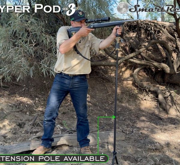 The Hyper Pod 3 is designed to allow for mobile hunting and the ability to shoot accurately with fast set up time. When deployed it allows a shooter to get in position and shoot within seconds. It also allows carriage while walking around ether on the firearm or in hand when detached. The shooter can shoot standing with Hyper Pod 3 tucked into the hip, kneeling with the Hyper Pod 3 on the ground, or sitting with Hyper Pod 3 on the ground.