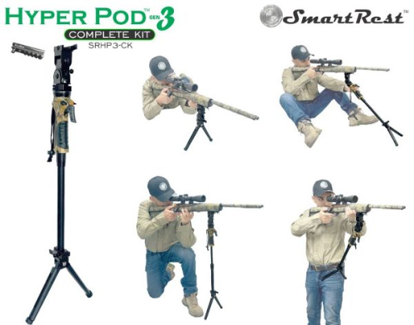 The Hyper Pod 3 is designed to allow for mobile hunting and the ability to shoot accurately with fast set up time. When deployed it allows a shooter to get in position and shoot within seconds. It also allows carriage while walking around ether on the firearm or in hand when detached. The shooter can shoot standing with Hyper Pod 3 tucked into the hip, kneeling with the Hyper Pod 3 on the ground, or sitting with Hyper Pod 3 on the ground.