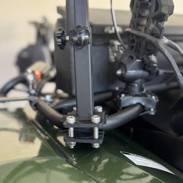 It clamps on to tubes and bars usually found on Quad Bikes and ATV’s. If your bike does not have a steel tube tray you can mount a flat ply board on to the plastic tray and then use the board as your mounting platform.