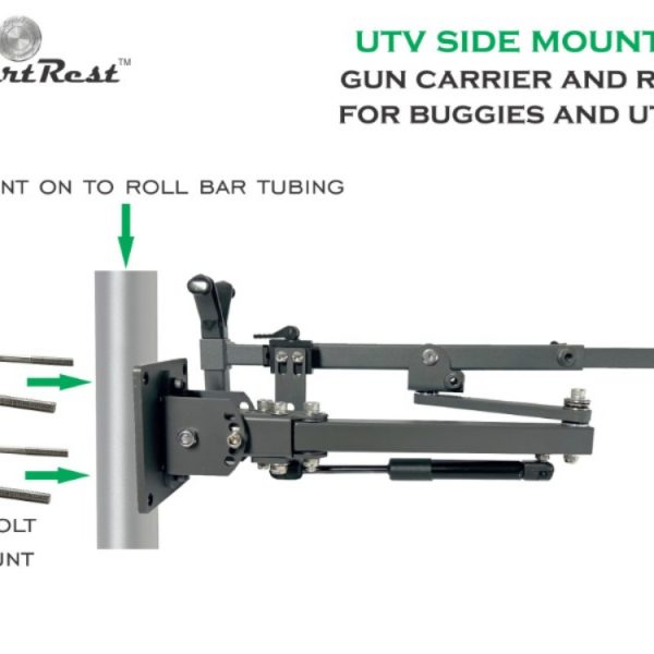 The UTV Side Mount 3 Gun Rest is a steel-framed Gun Rest and Cradle system that stores a firearm in a safe position while traveling and acts as a stable rifle support for excellent accuracy while taking a shot. It is designed to be mounted in the doorway opening of a side-by-side or UTV vehicle. Usual mounting points are (but not limited to) handlebars or roll bar pipes in the doorway opening of the vehicle door entrance. The advantages of a mounted firearm in this location are: