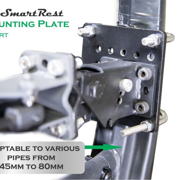 Mounting Clamps and Options – the standard issue clamp is a two part clamp. It closes up on to square and round pipes from 17mm to 45mm. If the pipe or bar is larger than 45mm a Mounting Plate with U Bolts is required. The Mounting plate comes in two size options. See SmartRest – Mounting Plate for more information.