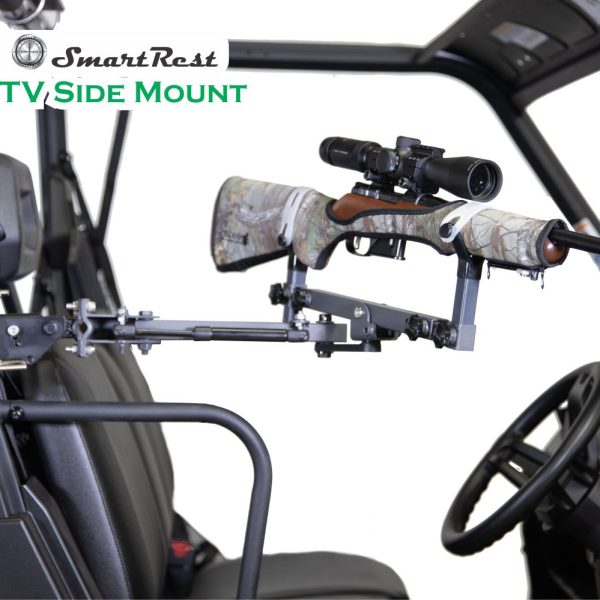 The Side Mount Gun Rest is a steel framed Gun Rest and Cradle system that stores a firearm in a safe position while travelling and acts as a stable rifle support for excellent accuracy while taking a shot. It is designed to be mounted in the door way opening of a side x side or UTV vehicle. Usual mounting points are (but not limited to) handle bars or roll bar pipes in the door way opening of the vehicle door entrance. The advantages of a mounted firearm in this location are: