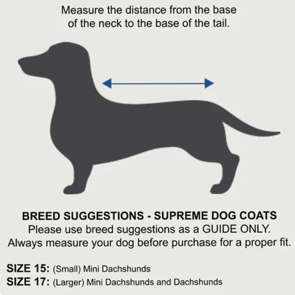 The ZEEZ Supreme Dachshund Dog Coat is made and designed for long, narrow bodies. These coats feature buckles that are high quality, strong, sophisticated and so easy to use with their quick snap function. The exterior is made from a tough 1680 denier jacquard polyester that has been PU coated, making the coat waterproof, showerproof and water resistant. The 200g PP cotton filling and 450g of luxurious soft faux fur interior lining ensures your dog stays warm on cold days. Washing Instructions:
