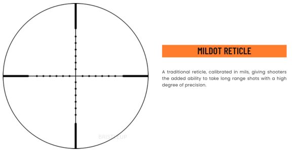 - Mildot Reticle: Calibrated in mils for precise long-range shooting.