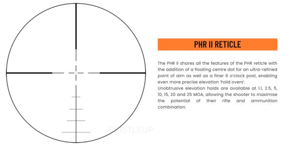 - PHR II Reticle: Enhanced with a floating center dot and finer 6 o’clock post for precise elevation hold overs.