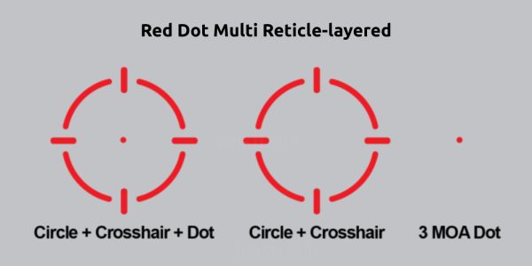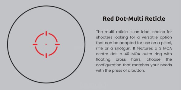 The multi reticle system is a standout feature that significantly enhances user experience by providing options to switch between reticle types depending on the shooting conditions. The large outer circle aids in faster target acquisition and helps maintain focus on the target through the recoil cycle, while the sharp 3 MOA dot allows for precise aiming at longer distances.