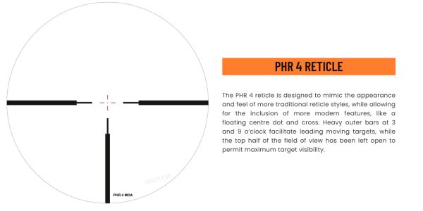 - PHR 4 Reticle – Bold outer posts and fine inner lines deliver fast target acquisition and accurate leads