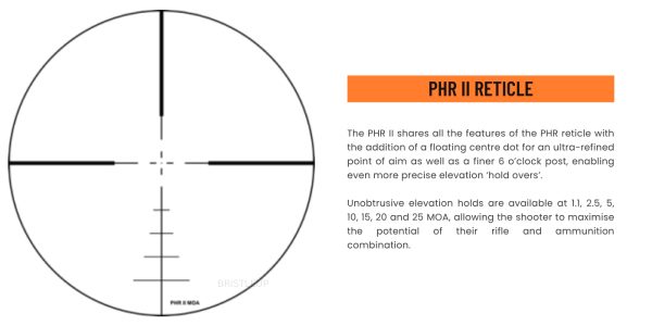 | Available Reticles | PHR II reticle PHR II Illuminated reticle R3 reticle R3 Illuminated reticle |